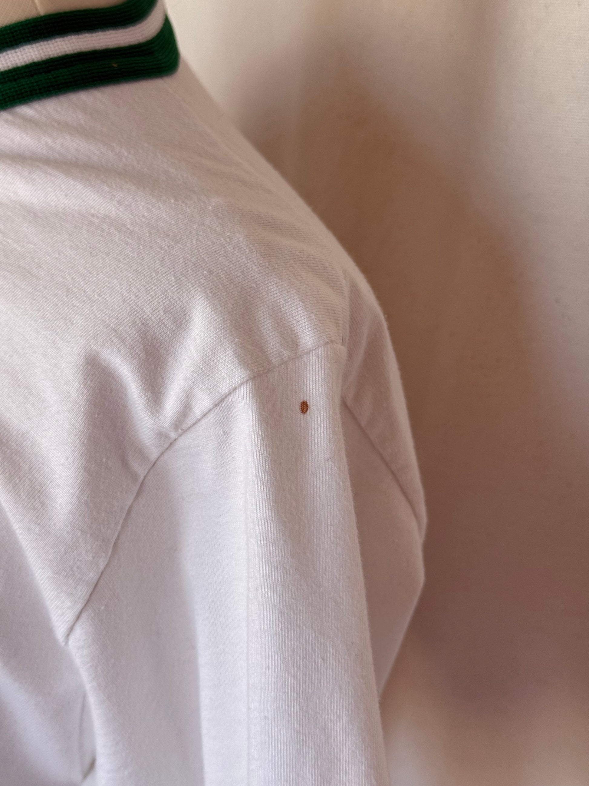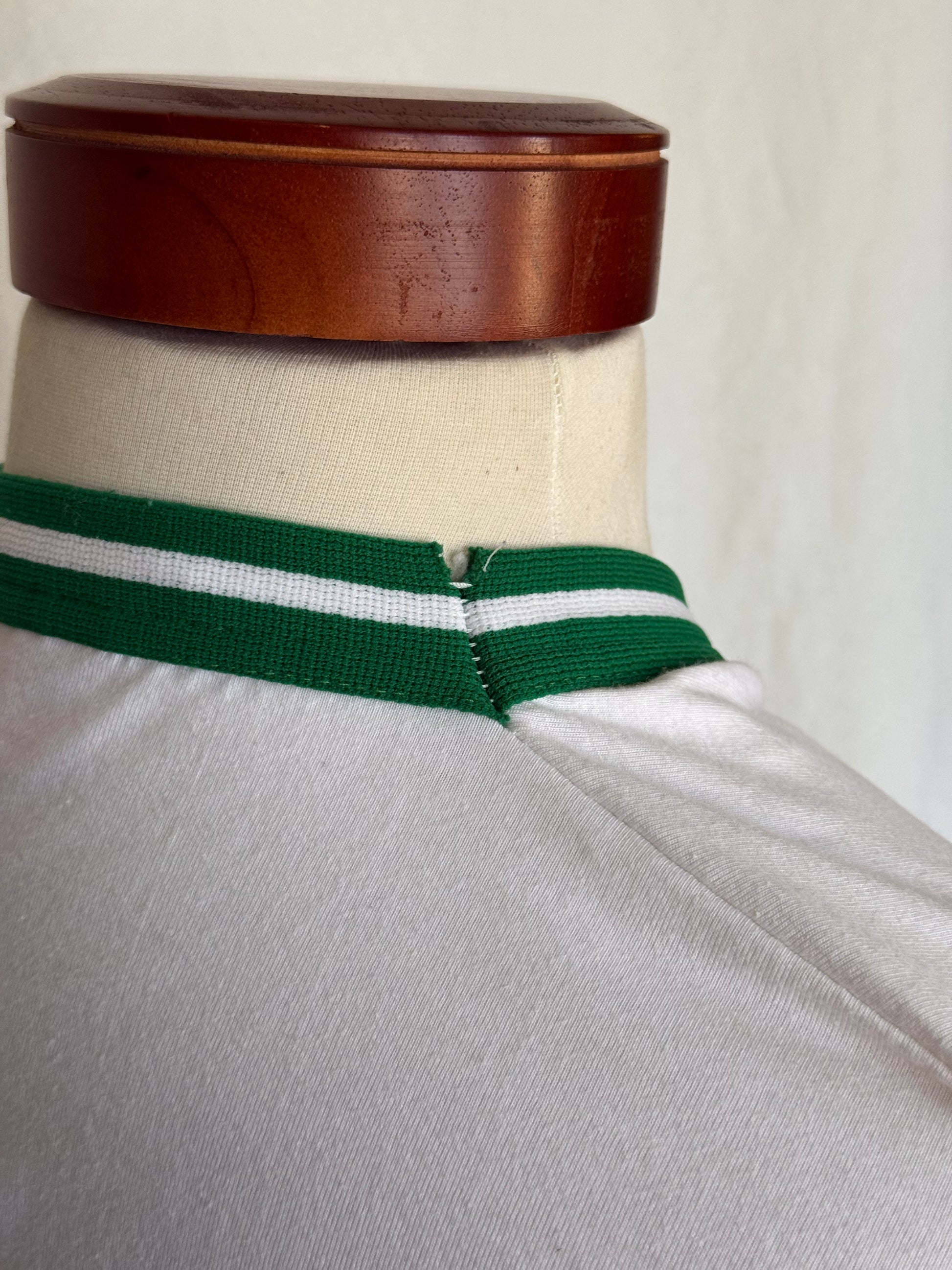 • Green and White striped cuffs on the sleeves and neckline